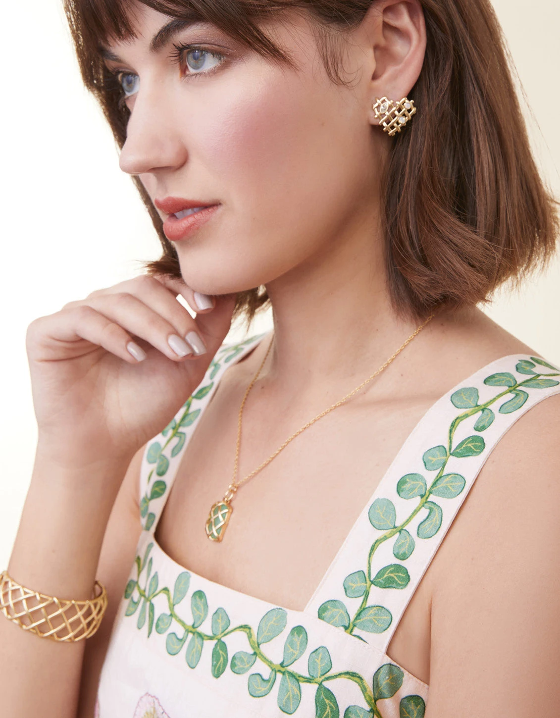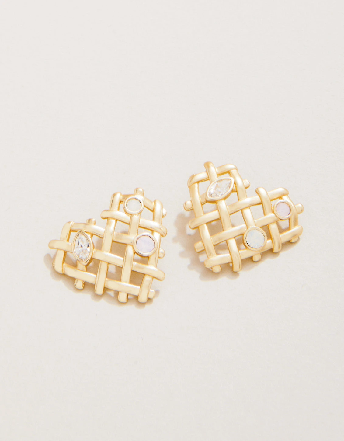 Our Woven Heart Earrings feature a woven pattern of 18kt matte gold plating in the shape of a heart with crystal accents. Subtle charm shines through this must-have accessory.