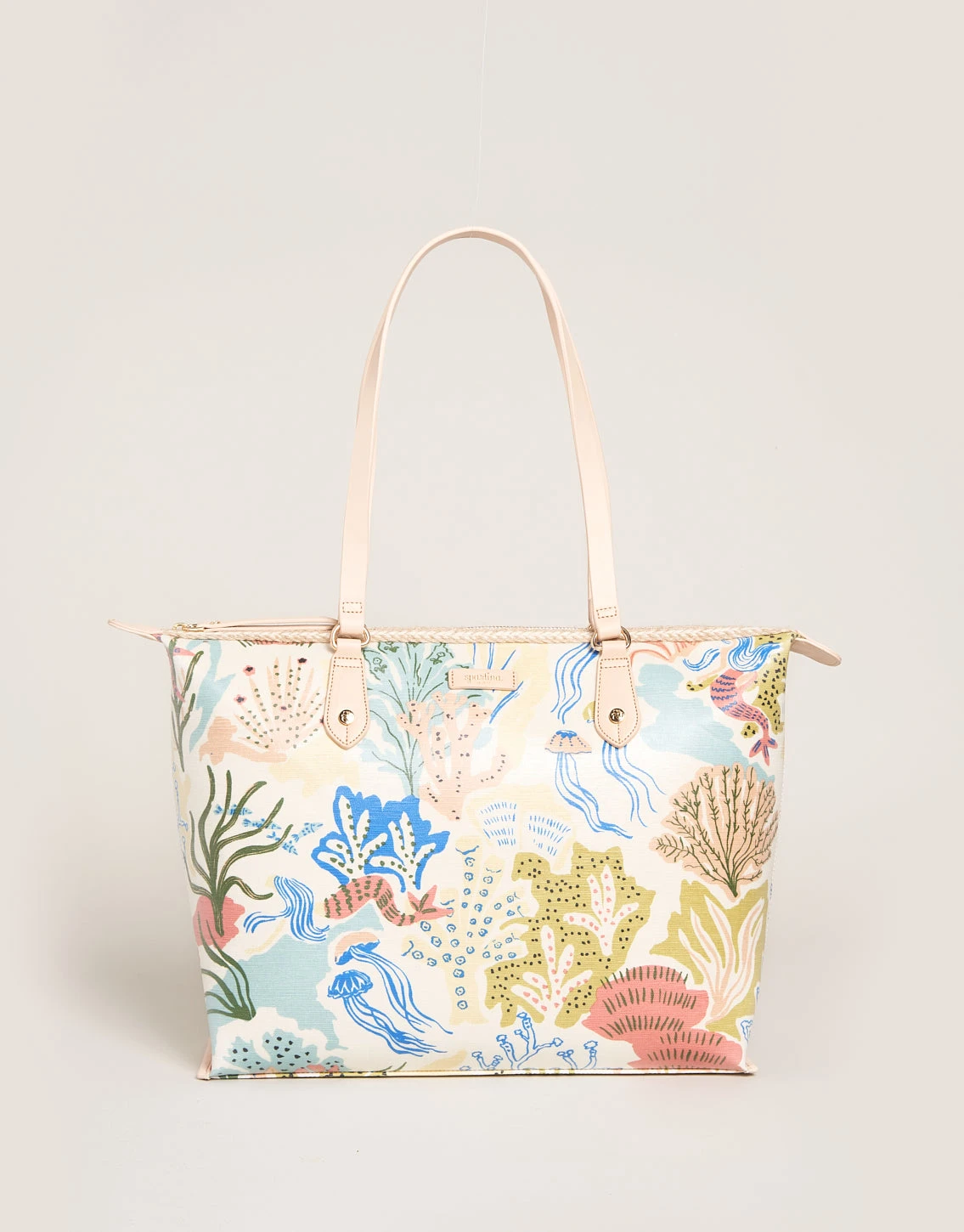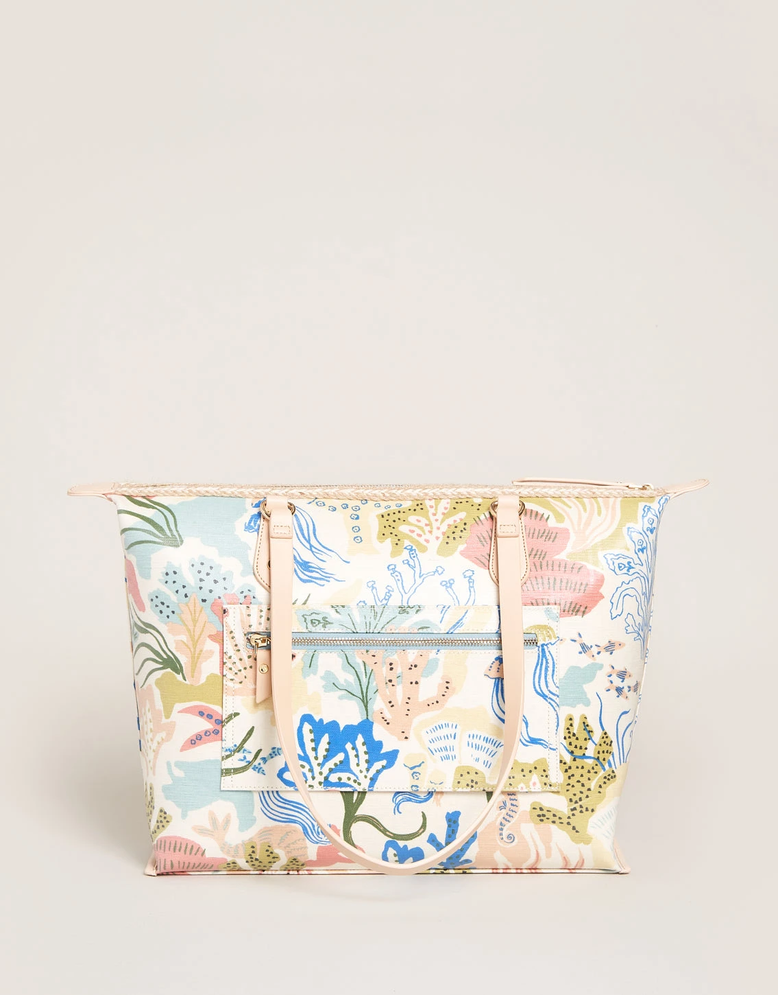 Mixing work and play? It’s easy with our Mermaid Sea fabric that is laminated with a splash-proof, stain resistant coating. This Zip Travel Tote has it all. The zipper top opens to a compartment roomy enough for your laptop or tablet, while the pockets organize your AirPods and sunblock for podcasts by the pool. On the backside, this traveler’s-best-friend features a zip pocket and trolley sleeve to easily carry atop your suitcase!